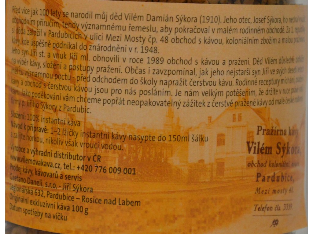 Praženo tradičním způsobem podle původních receptur Viléma Sýkory, zakladatele rodinných tradic poctivého českého pražení v Pardubicích.