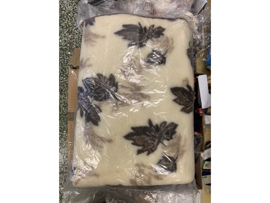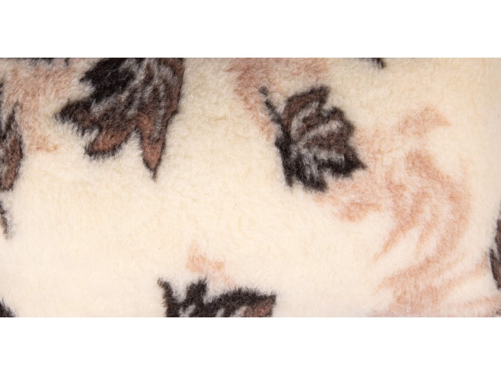 Deka je z obou stran v přírodním béžovém odstínu s potiskem javorových listů, zakončená je lemovkou. Velikost deky je 155 x 200 cm. Značka Lunia. Gramáž: 1 300 g.